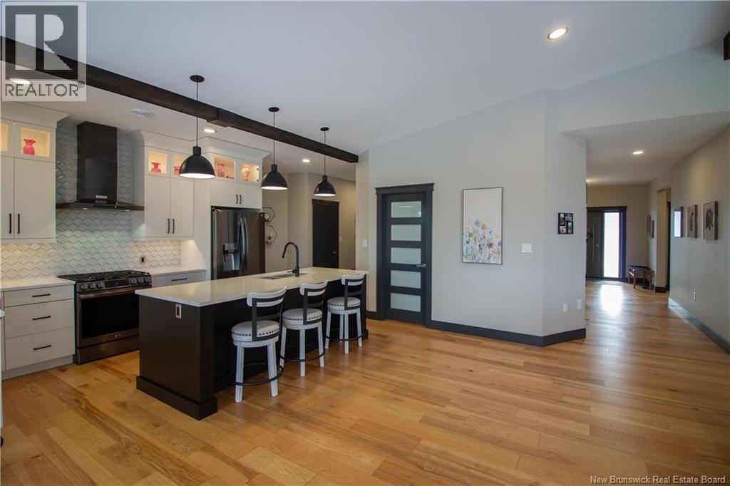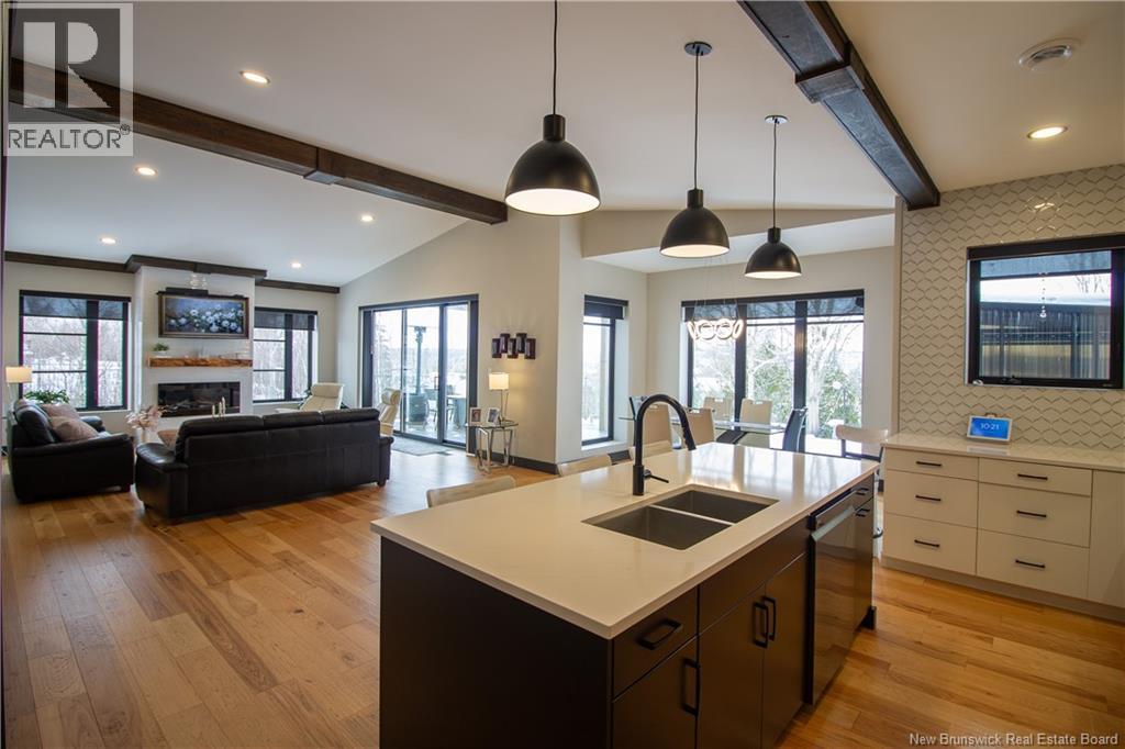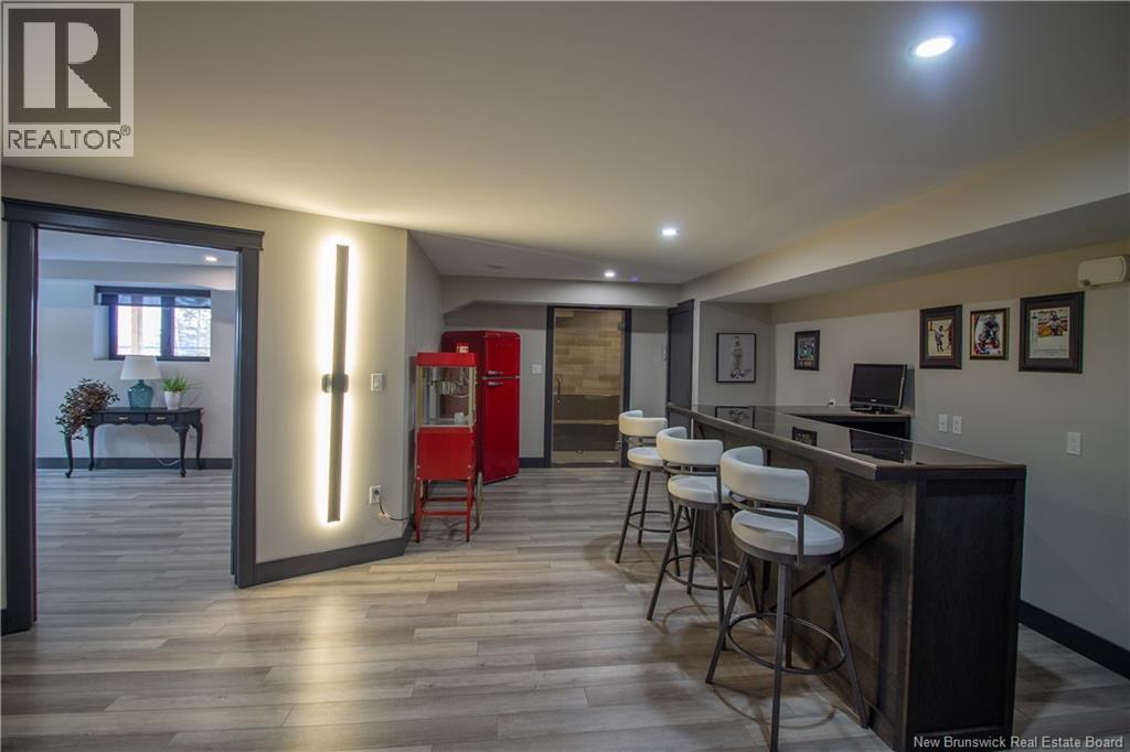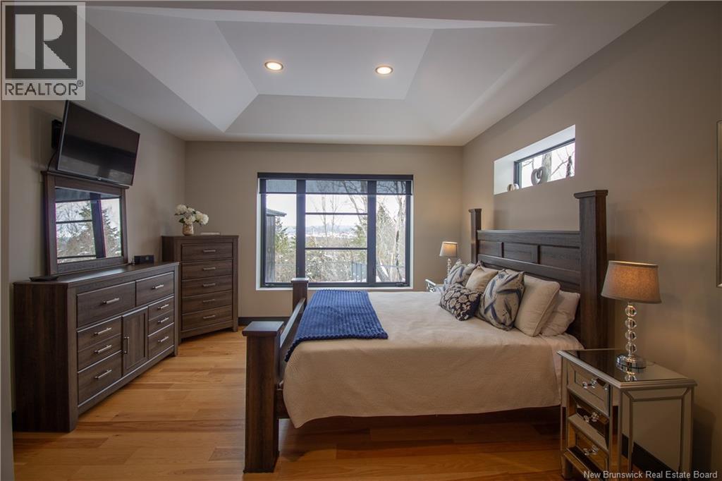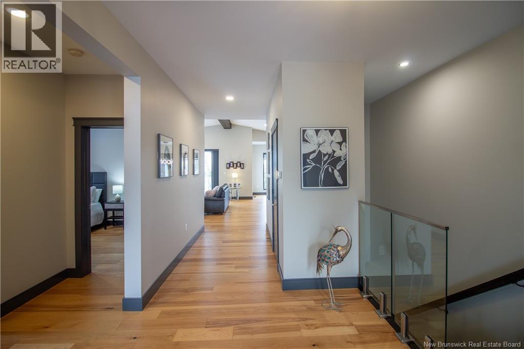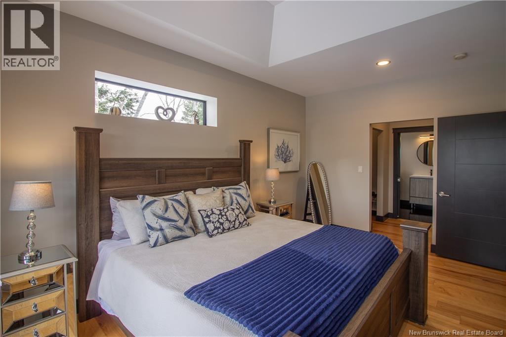 Welcome to 11 Robert Ross, this exceptional home is located 10 minutes from Quispamsis and walking distance to the new Summit Centre. Contemporary design and tasteful finishes, no expense spared. Stamped concrete covered fron veranda. Off the foyer you will find 2 bedrooms with large windows and 4 pc bath with laundry. Large living room with vaulted ceilings, fireplace, patio door to back deck (Composite) with pergola and glass rails looking over Darlings Lake and stunning sunsets. Open concept with stunning kitchen with quartz counters, cabinet lighting, walk in pantry with microwave and cabinetry, island, gas range and bright dining room. Master bedroom features a tray ceiling, pot lights, picture window, walk in closet and 4 pc ensuite with pocket door and custom dual head shower. Attached heated garage boasts epoxy floor, glass door, and a roll up screen door to enjoy the fresh air and add to your living space. Tile and engineered hardwood floors throughout main level. Down features a bar with sink, large sauna, family room, 2 bedrooms and a non-conforming bedroom. 4 pc bath, storage mechanical room, 2nd mechanical room with storage, ducted heat pump and generator panel. Fully finished basement with pot lights throughout, ICF foundation to the roof. Detached 2nd garage, fenced yard with lighting, concrete patio with enclosed hot tub, soffet lights, metal roof, central vac, and much more. Call today. (id:35613)