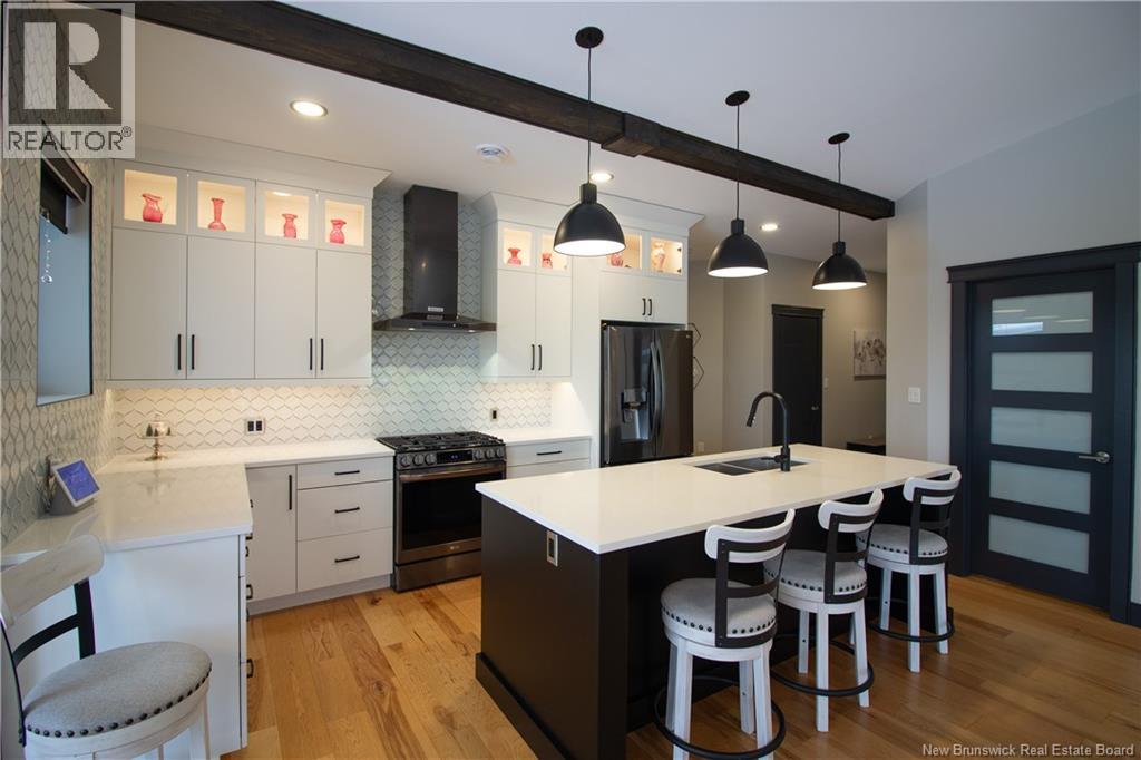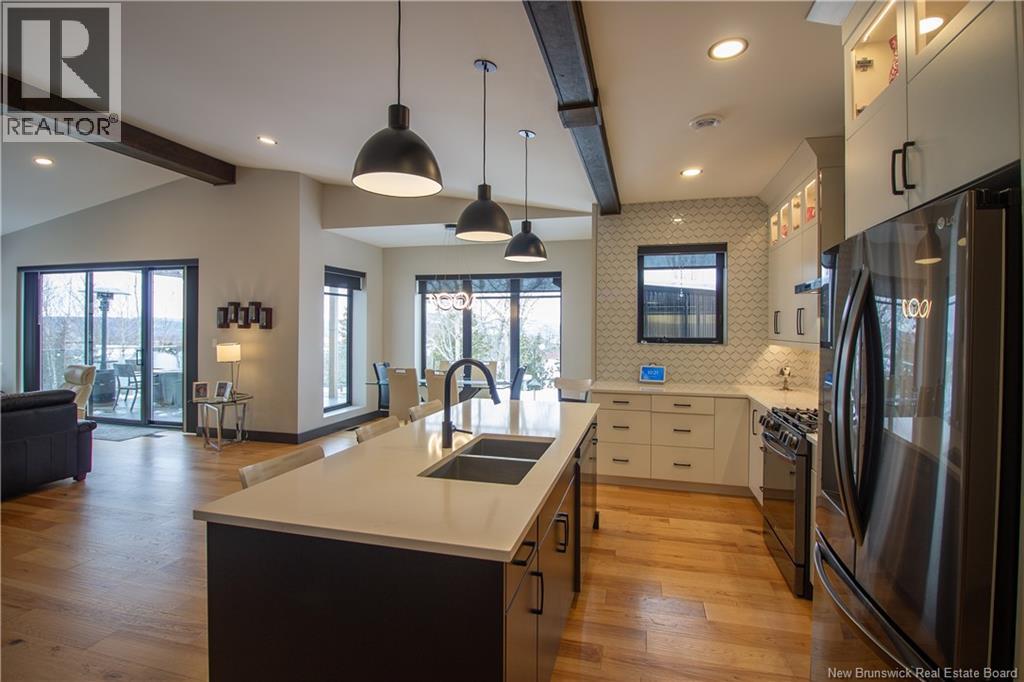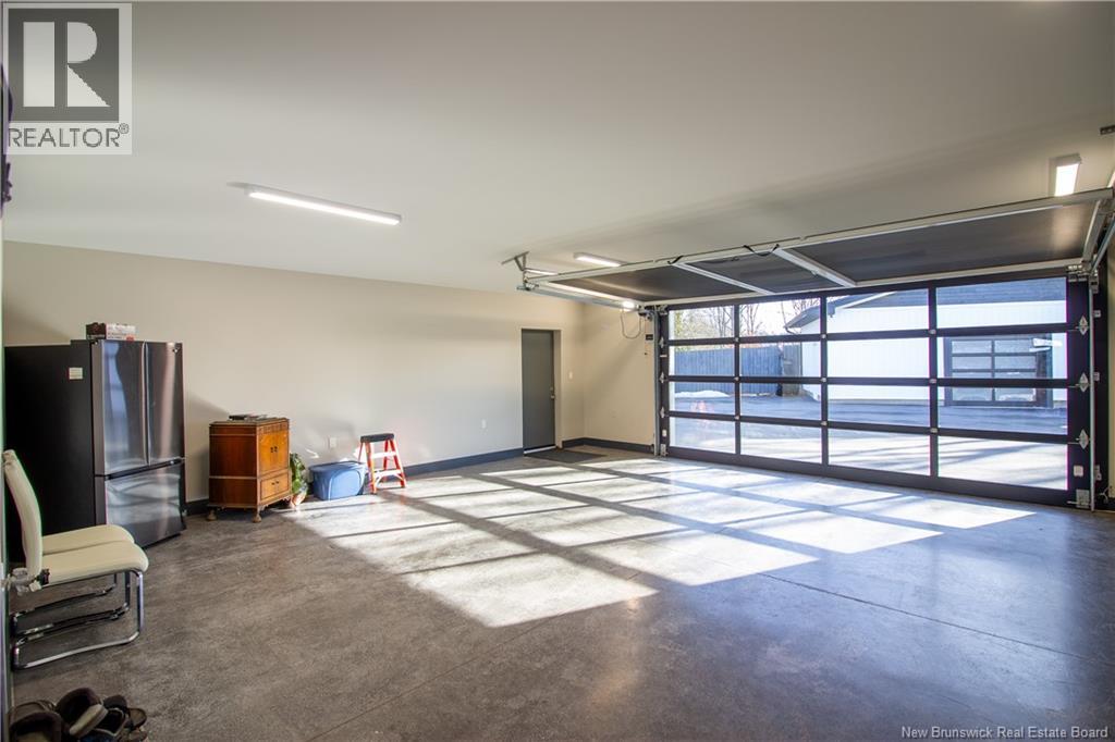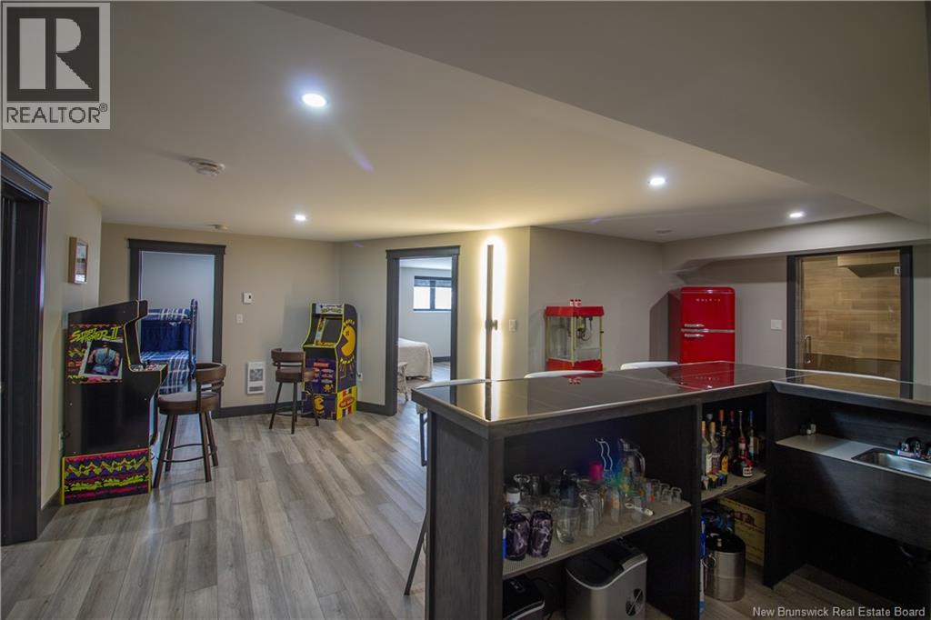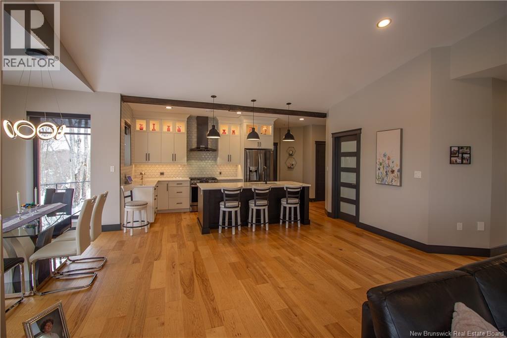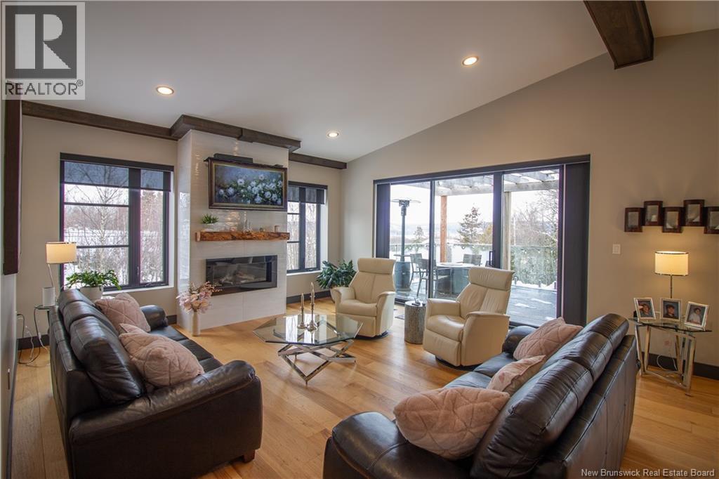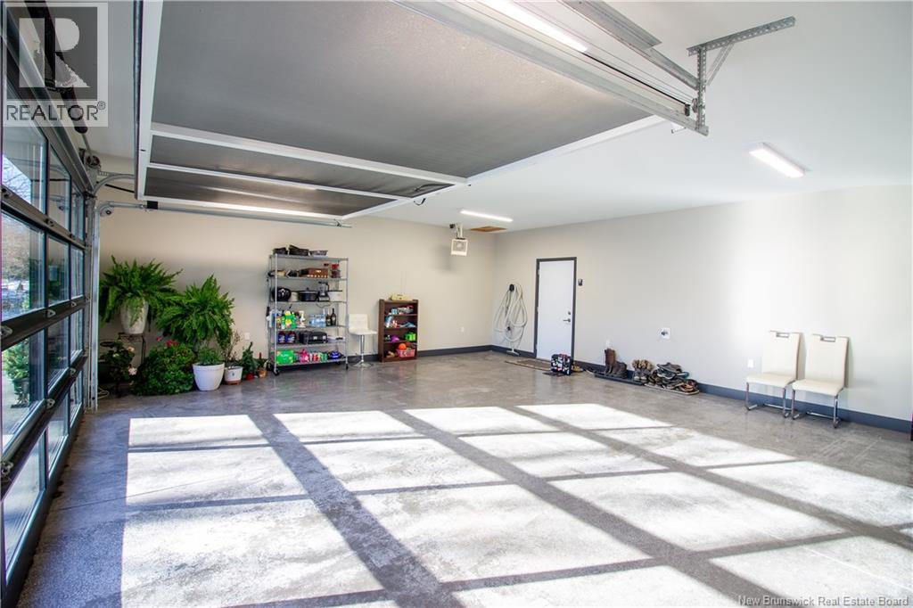 Welcome to 11 Robert Ross, this exceptional home is located 10 minutes from Quispamsis and walking distance to the new Summit Centre. Contemporary design and tasteful finishes, no expense spared. Stamped concrete covered fron veranda. Off the foyer you will find 2 bedrooms with large windows and 4 pc bath with laundry. Large living room with vaulted ceilings, fireplace, patio door to back deck (Composite) with pergola and glass rails looking over Darlings Lake and stunning sunsets. Open concept with stunning kitchen with quartz counters, cabinet lighting, walk in pantry with microwave and cabinetry, island, gas range and bright dining room. Master bedroom features a tray ceiling, pot lights, picture window, walk in closet and 4 pc ensuite with pocket door and custom dual head shower. Attached heated garage boasts epoxy floor, glass door, and a roll up screen door to enjoy the fresh air and add to your living space. Tile and engineered hardwood floors throughout main level. Down features a bar with sink, large sauna, family room, 2 bedrooms and a non-conforming bedroom. 4 pc bath, storage mechanical room, 2nd mechanical room with storage, ducted heat pump and generator panel. Fully finished basement with pot lights throughout, ICF foundation to the roof. Detached 2nd garage, fenced yard with lighting, concrete patio with enclosed hot tub, soffet lights, metal roof, central vac, and much more. Call today. (id:35613)