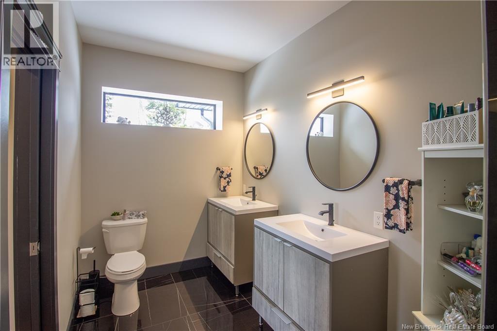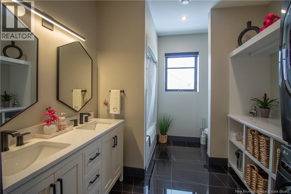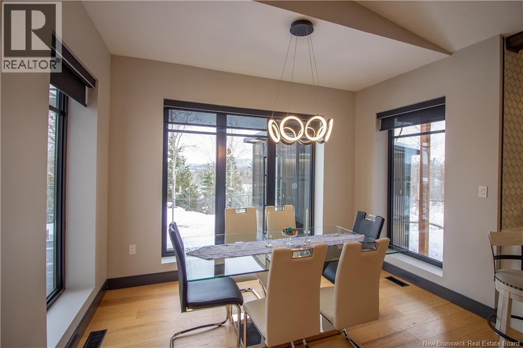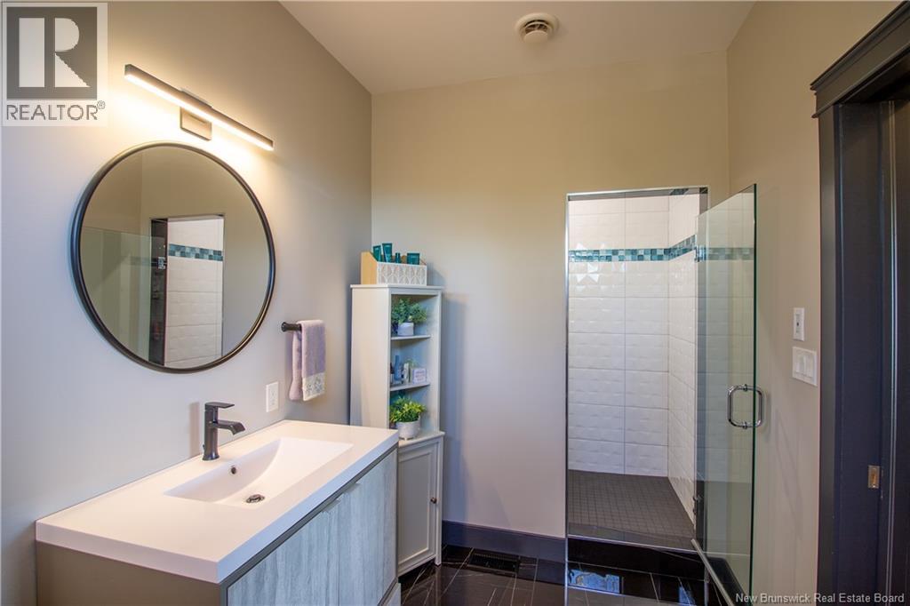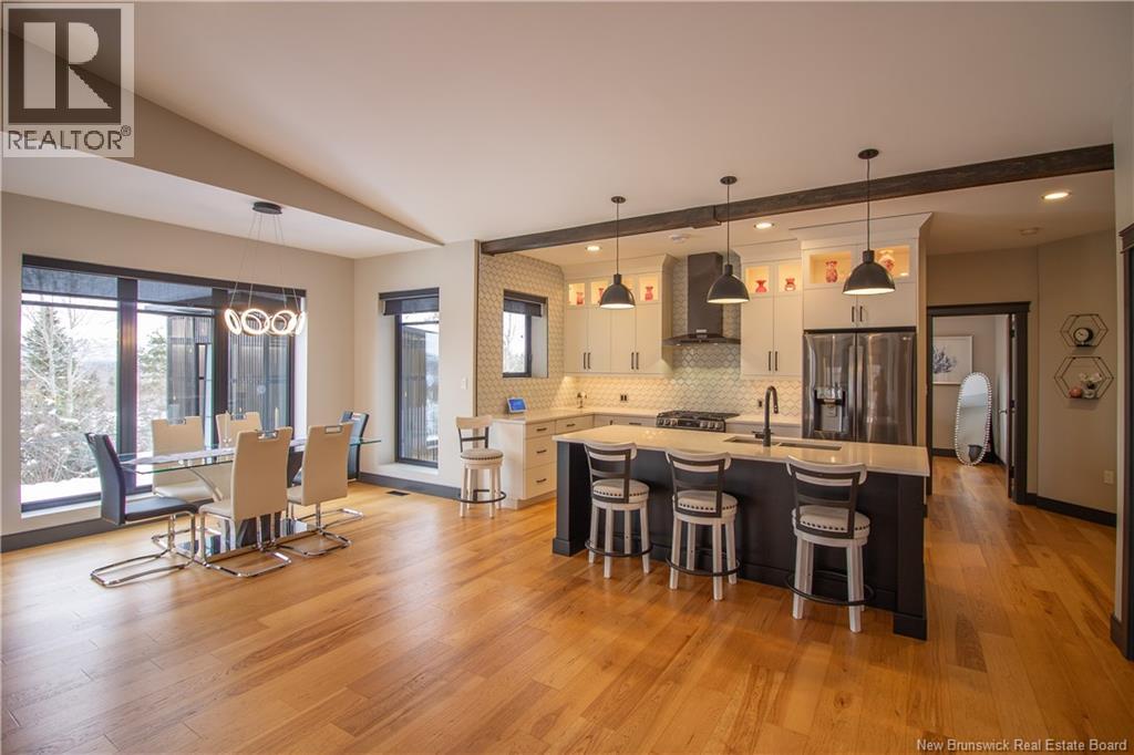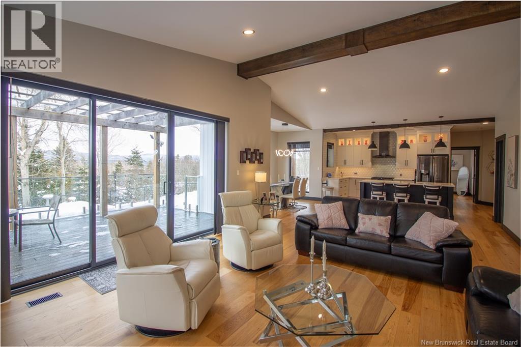 Welcome to 11 Robert Ross, this exceptional home is located 10 minutes from Quispamsis and walking distance to the new Summit Centre. Contemporary design and tasteful finishes, no expense spared. Stamped concrete covered fron veranda. Off the foyer you will find 2 bedrooms with large windows and 4 pc bath with laundry. Large living room with vaulted ceilings, fireplace, patio door to back deck (Composite) with pergola and glass rails looking over Darlings Lake and stunning sunsets. Open concept with stunning kitchen with quartz counters, cabinet lighting, walk in pantry with microwave and cabinetry, island, gas range and bright dining room. Master bedroom features a tray ceiling, pot lights, picture window, walk in closet and 4 pc ensuite with pocket door and custom dual head shower. Attached heated garage boasts epoxy floor, glass door, and a roll up screen door to enjoy the fresh air and add to your living space. Tile and engineered hardwood floors throughout main level. Down features a bar with sink, large sauna, family room, 2 bedrooms and a non-conforming bedroom. 4 pc bath, storage mechanical room, 2nd mechanical room with storage, ducted heat pump and generator panel. Fully finished basement with pot lights throughout, ICF foundation to the roof. Detached 2nd garage, fenced yard with lighting, concrete patio with enclosed hot tub, soffet lights, metal roof, central vac, and much more. Call today. (id:35613)