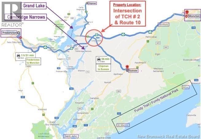 Welcome to the former Covered Bridge Visitor Info Center! This unique 5 acre site is fully developed and could be the ideal location for your next big residential or commercial venture! Strategically located at the crossroad of Trans-Canada Hwy#2 and Route 10, which services both local residents and visitors travelling to neighboring provinces and to popular NB sites such as Grand Lake, Cambridge Narrows, Coles Island, Fundy National Park, Sussex, and beyond. Located halfway between Moncton & Fredericton, with average daily traffic counts (AADT) estimated at 17,000 vehicles, peaking at 30,000+ vehicles during summer months due to increased vacation travel. The main building has ~2,000 square feet of space and previously operated as a provincial Visitor Information Center. It was designed to look like an iconic NB Covered Bridge in a beautiful park like setting. Featuring commercial grade construction, high ceilings with attractive cedar beams, hemlock flooring, and large windows offering natural lighting and scenic nature views. The building has been renovated with 3 new washrooms and a new kitchen space. The site has a large paved driveway and parking lot, drilled well, underground electrical services, and a commercial grade septic system with lift station designed to accommodate 80 washroom visitors per half hour. Available documents include: site plan, building floor plans, septic system diagram, and original engineering drawings. (id:35613)