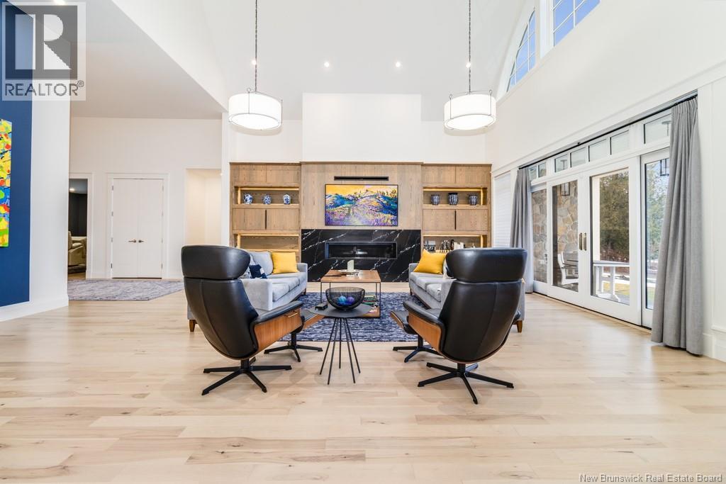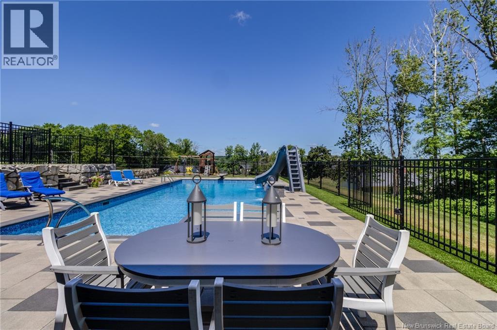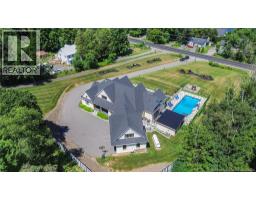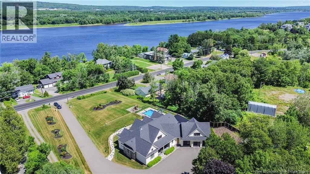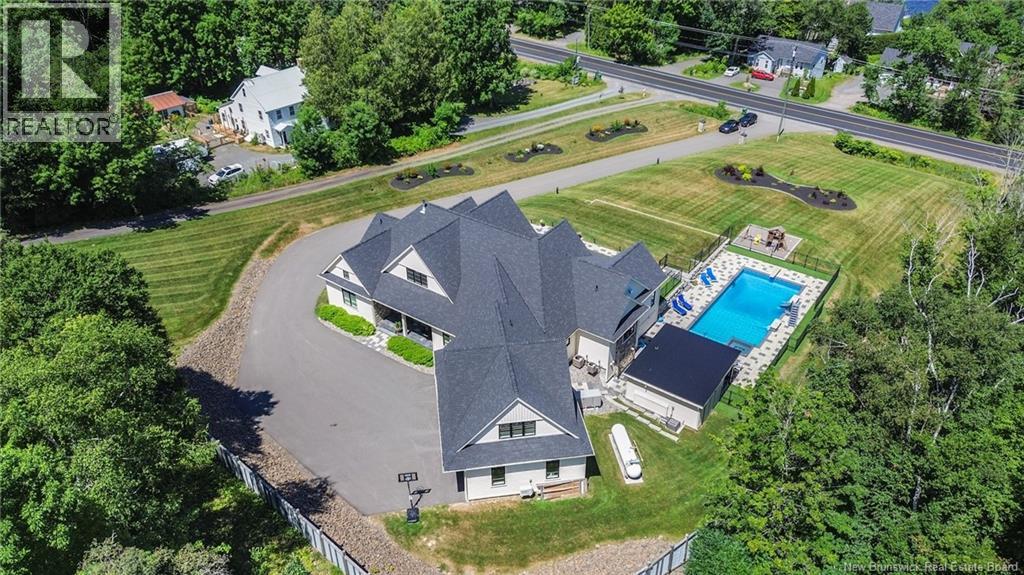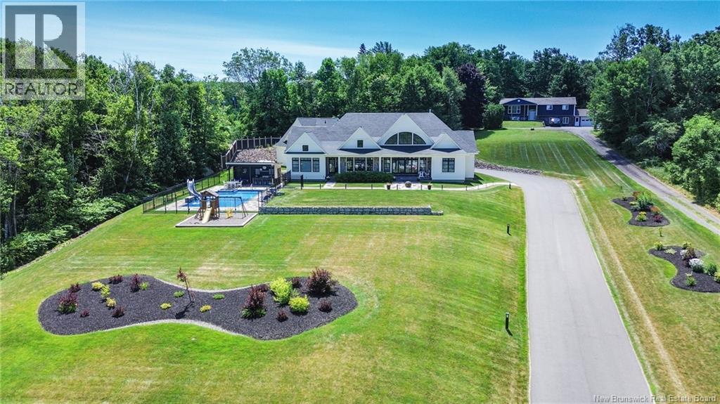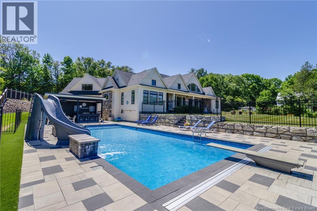 An exquisitely crafted, custom-built home situated on 1.5 acres in Fredericton South. No detail has been spared in the conception and construction of this remarkable estate-style property with over 5,300 sqft of finished space. The open-concept main living area features a spacious living room adorned with bespoke built-in cabinetry,23 foot ceilings, gas fireplace, and patio doors that lead to an outdoor sitting area offering serene river and overland views. The gourmet kitchen showcases a generous island, a eight-burner gas stove, dual dishwashers and a butlers pantry. The primary suite is a sanctuary of luxury featuring cathedral ceilings, a sprawling 15x18 walk-in closet and a spa-inspired bathroom featuring dual vanities, a custom-tiled shower and heated floors. At the opposite end of the home are two additional well-appointed bedrooms each with its own ensuite bath. A versatile fourth bedroom, currently utilized as a media room, and a large office complete this level. Staircase accessed from the mudroom, leads to the gym area and ½ bath located above the oversized 3 car garage. The lower level is partially finished including a 4th full bath, a spacious family room, and a children's secret room featuring a ball pit and climbing ladder. The outdoor amenities are equally impressive, with an exquisite in-ground pool, an expansive pool house complete with a bar and bathroom, and even an artificial turf putting green the perfect complement to this stunning estate. (id:35613)