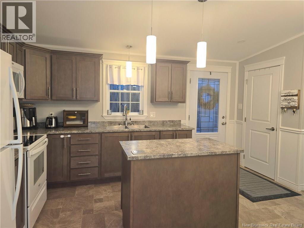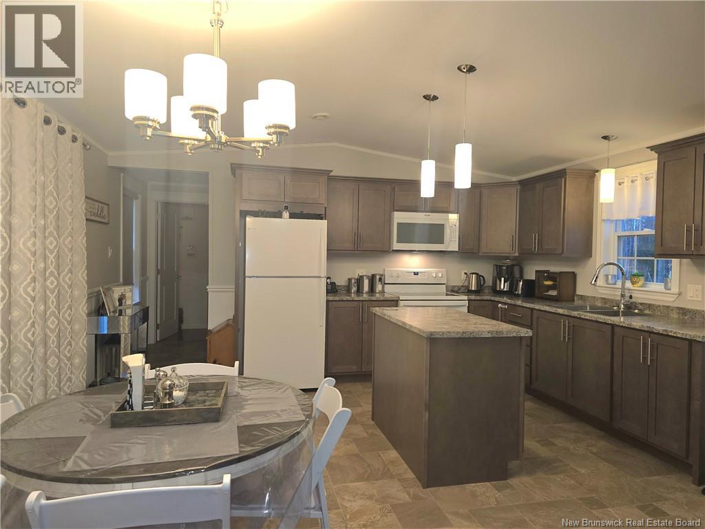 Welcome to this well-maintained 2019 Supreme Minihome located in the sought-after Gretna Green Minihome Park. Measuring 16 x 60, this attractive home offers a bright and functional layout with two bedrooms and one-and-a-half bathrooms, set on a desirable end lot that provides extra privacy with trees along the back and one side, and only one neighboring home. The spacious open-concept kitchen, dining, and living area features cathedral ceilings, creating a bright and inviting atmosphere throughout. The kitchen offers beautiful cabinetry, a large island with electrical outlet, ample storage space, and a generous work surface ideal for meal preparation. Patio doors off the dining area open to a back step, perfect for outdoor relaxation or barbecuing. The primary bedroom is located at one end of the home and includes a private half bath and laundry area, while the second bedroom and main full bath are situated at the opposite end, providing a comfortable separation of space. Interior finishes include laminate flooring in the living room and bedrooms, and linoleum flooring in the kitchen and bathrooms for easy maintenance and durability. Outside, the property offers a nice-sized lot with two storage sheds and mature trees that add shade and privacy. This home has been well cared for and is move-in ready, offering comfortable, low-maintenance living in a quiet and friendly community setting. Home is Move-In Ready (id:35613)