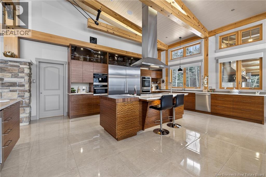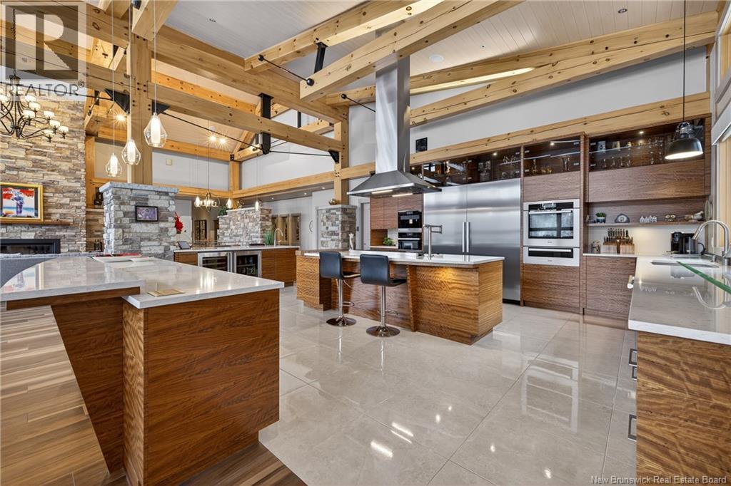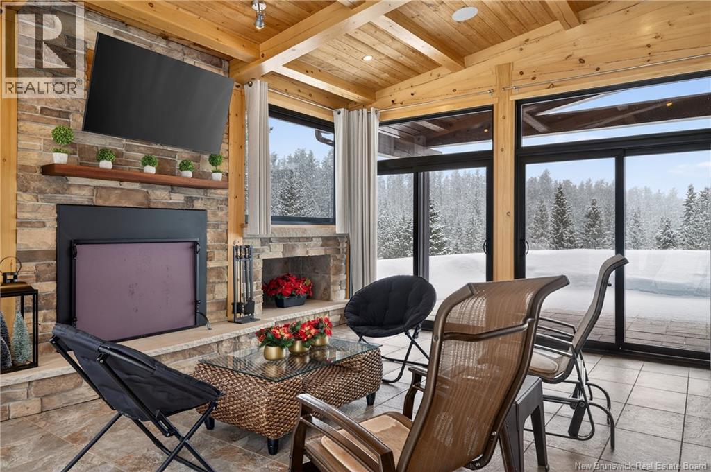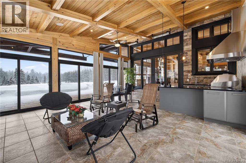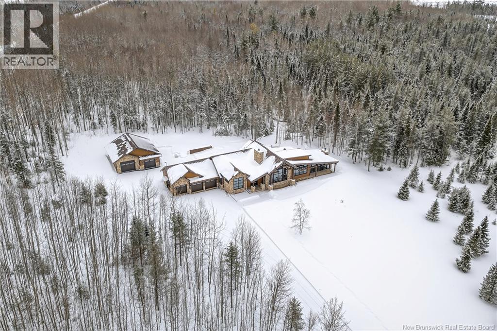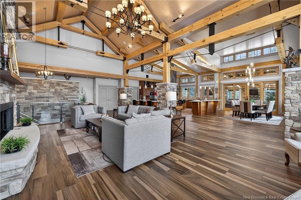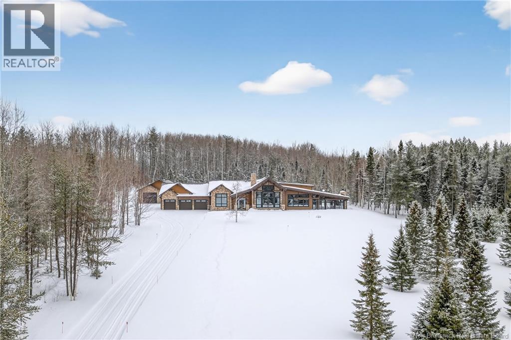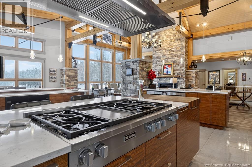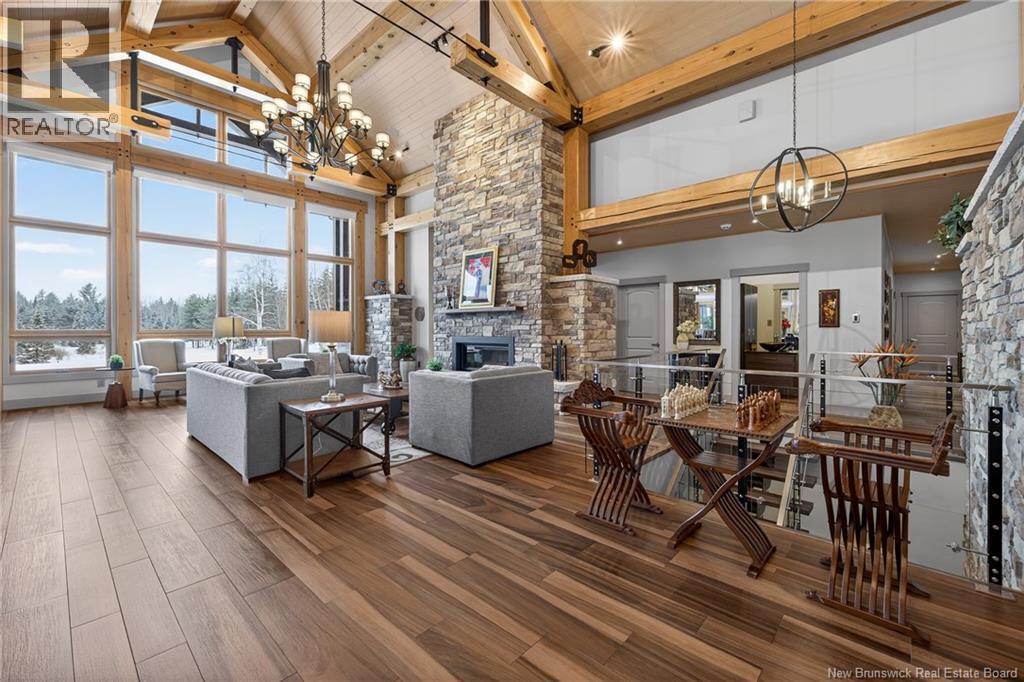 Set on 20 private wooded acres, this exceptional residence offers remarkable privacy and rare tranquility. Timber frame construction with a soaring 23-foot cathedral ceiling and massive exposed beams creates a warm and inviting atmosphere, ideal for entertaining. The open-concept layout seamlessly connects the kitchen, dining, and living areas around a striking stone accent wall and central fireplace, while three fireplaces in total provide added comfort and a cozy ambiance throughout the winter months. The gourmet kitchen features custom solid Mozambique wood cabinetry, three generous islands, quartz countertops, an integrated butcher block, and premium Miele and Marvel appliances. Two full bedroom suites each include a private bathroom with a freestanding soaking tub and glass-enclosed shower. A spacious office supports working from home, and a dedicated home theatre room offers the perfect retreat for relaxation. The four-season veranda extends the living space year-round, ideal for gathering around the built-in barbecue and enjoying memorable moments. Radiant heated floors throughout the residence, Control4 smart home system, motorized blinds, security cameras, fibre optic internet, 22 kW automatic propane generator, and 400 AMP electrical service complete this rare estate where comfort, technology, and quality of life come together. (id:35613)