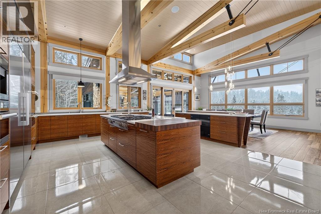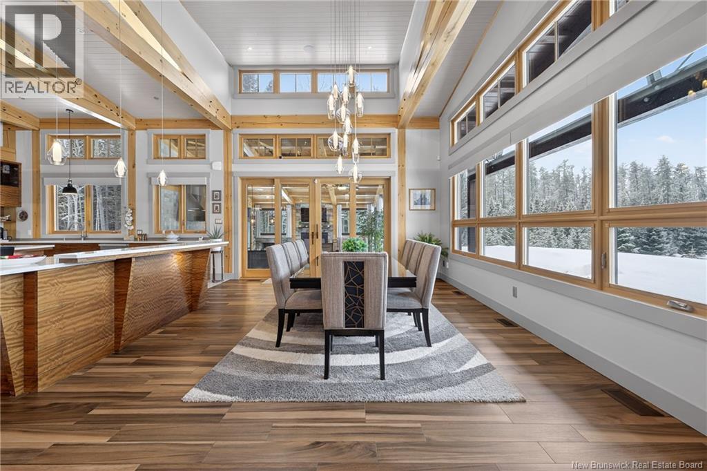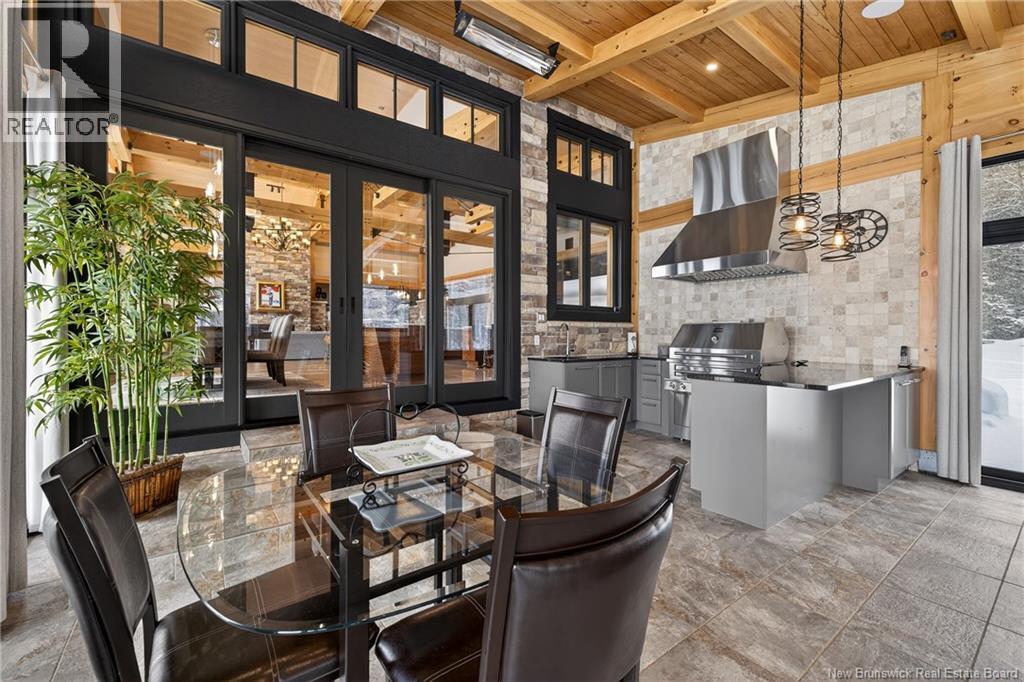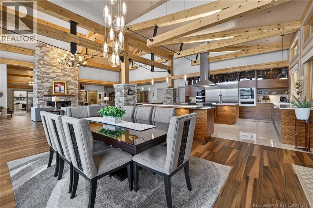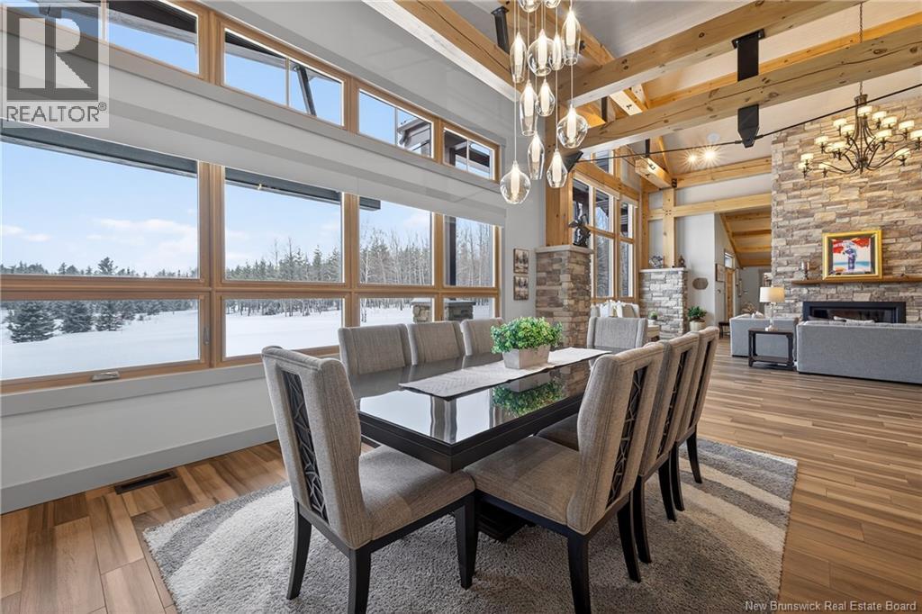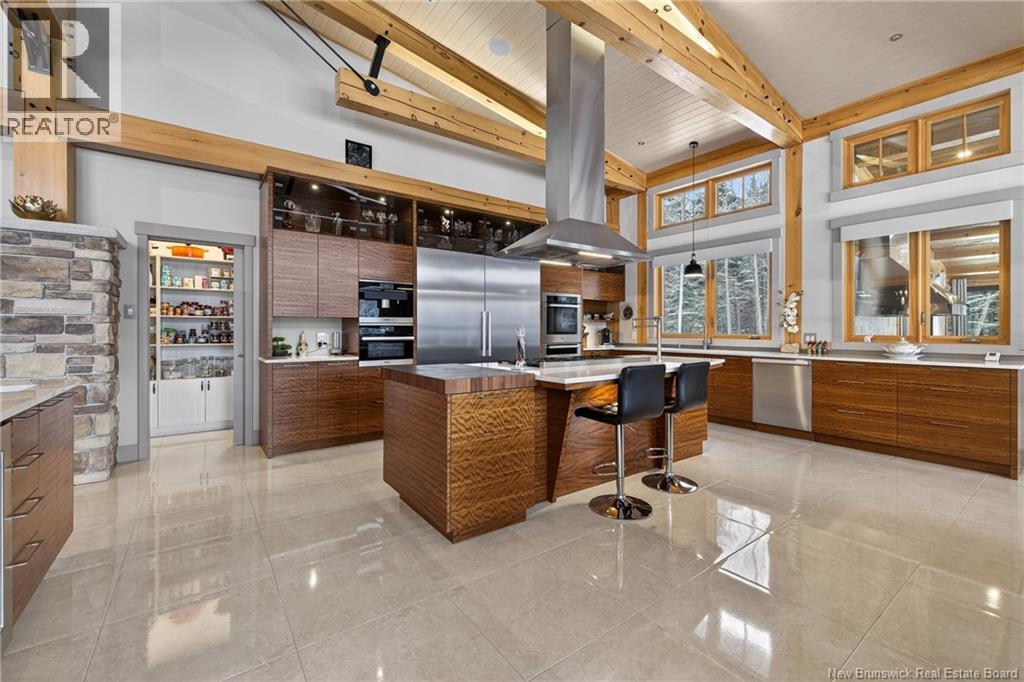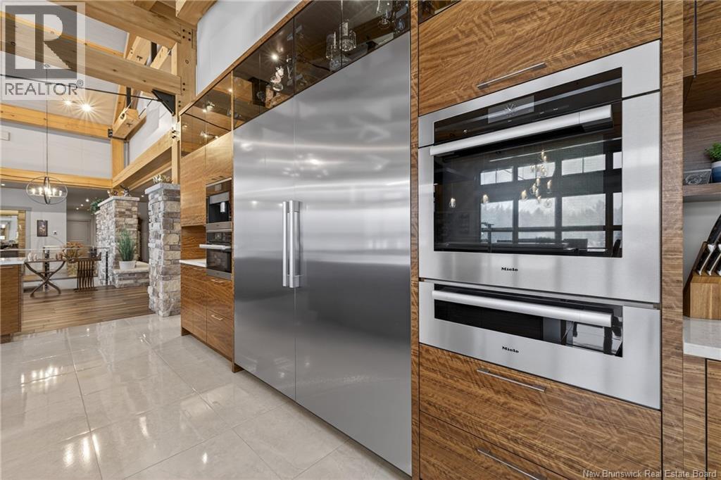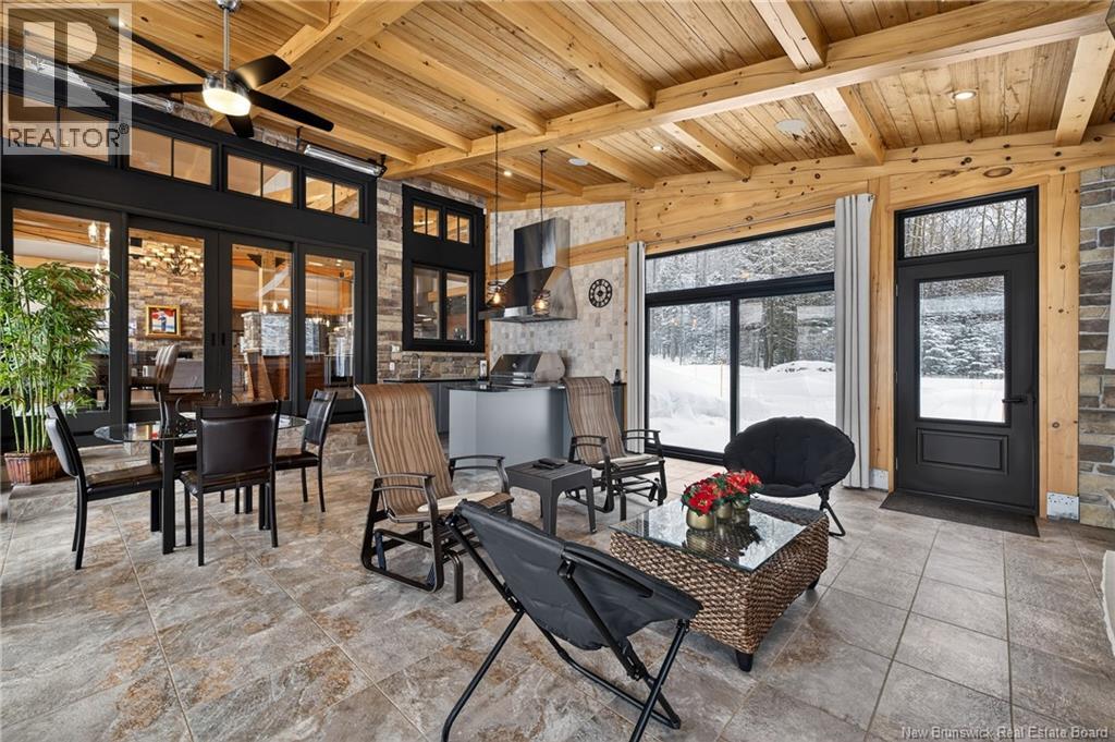 Set on 20 private wooded acres, this exceptional residence offers remarkable privacy and rare tranquility. Timber frame construction with a soaring 23-foot cathedral ceiling and massive exposed beams creates a warm and inviting atmosphere, ideal for entertaining. The open-concept layout seamlessly connects the kitchen, dining, and living areas around a striking stone accent wall and central fireplace, while three fireplaces in total provide added comfort and a cozy ambiance throughout the winter months. The gourmet kitchen features custom solid Mozambique wood cabinetry, three generous islands, quartz countertops, an integrated butcher block, and premium Miele and Marvel appliances. Two full bedroom suites each include a private bathroom with a freestanding soaking tub and glass-enclosed shower. A spacious office supports working from home, and a dedicated home theatre room offers the perfect retreat for relaxation. The four-season veranda extends the living space year-round, ideal for gathering around the built-in barbecue and enjoying memorable moments. Radiant heated floors throughout the residence, Control4 smart home system, motorized blinds, security cameras, fibre optic internet, 22 kW automatic propane generator, and 400 AMP electrical service complete this rare estate where comfort, technology, and quality of life come together. (id:35613)