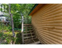 Welcome to your private retreat on beautiful Oromocto Lake, offering 1.08 acres of serene waterfront living with a peaceful bog backdrop. Originally crafted as a log chalet, this charming home now boasts stylish new vinyl siding while retaining its warm, rustic character. The main level features a spacious living room with a mini-split heat pump, opening to a deck with a metal gazeboperfect for lakeside lounging. A bright kitchen and large full bathroom complete this floor. Upstairs, a loft-style primary bedroom includes a convenient powder room. The walk-out basement offers two versatile dens (originally classified as bedrooms; windows do not meet current egress standards), a laundry room, rec room with wood stove, large storage closet, and direct access to the outdoors. The property also includes a double-car garage with original wood siding and a loft above, ideal for storage or a creative workspace. Perfect as a year-round home or seasonal getaway, this property blends modern updates with natural beauty in a truly special lakeside setting. (id:35613)