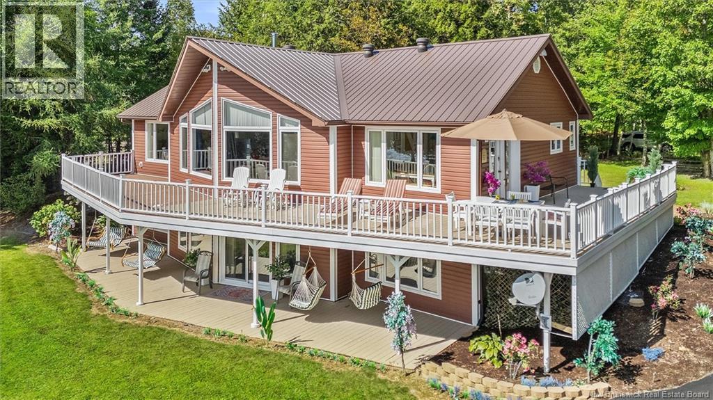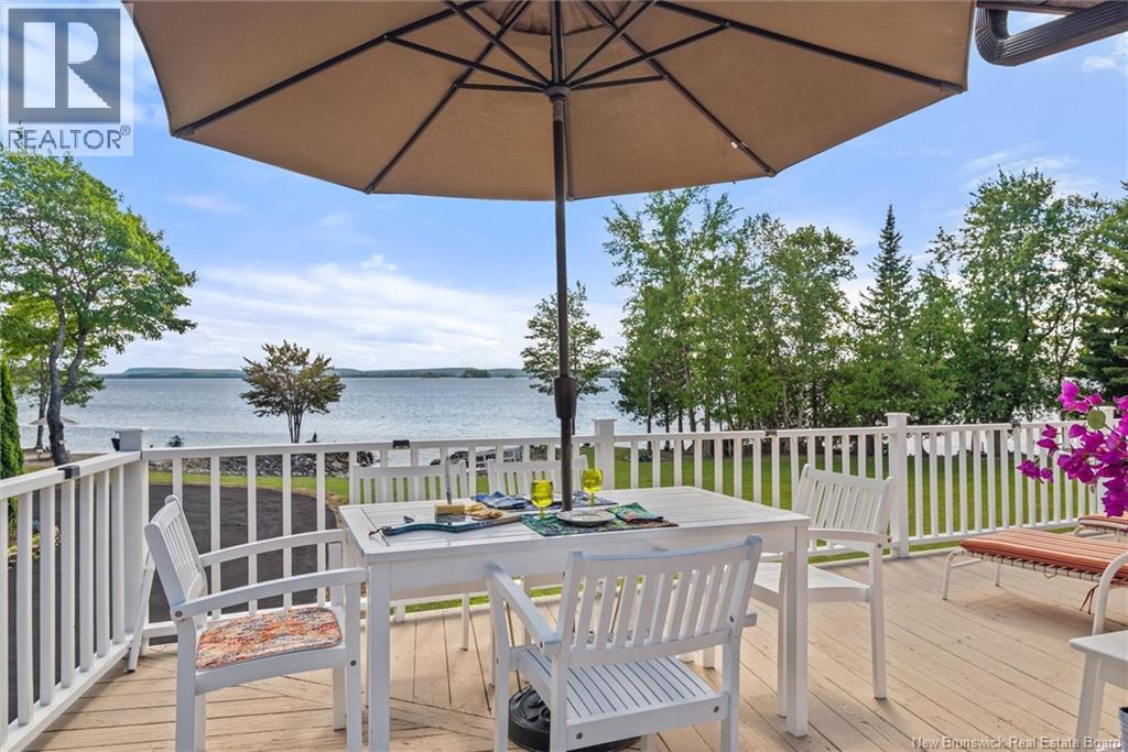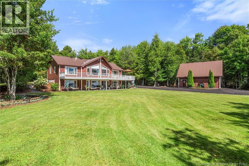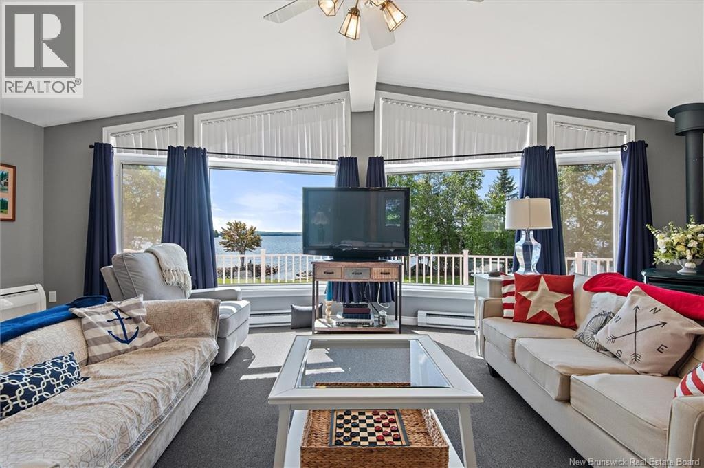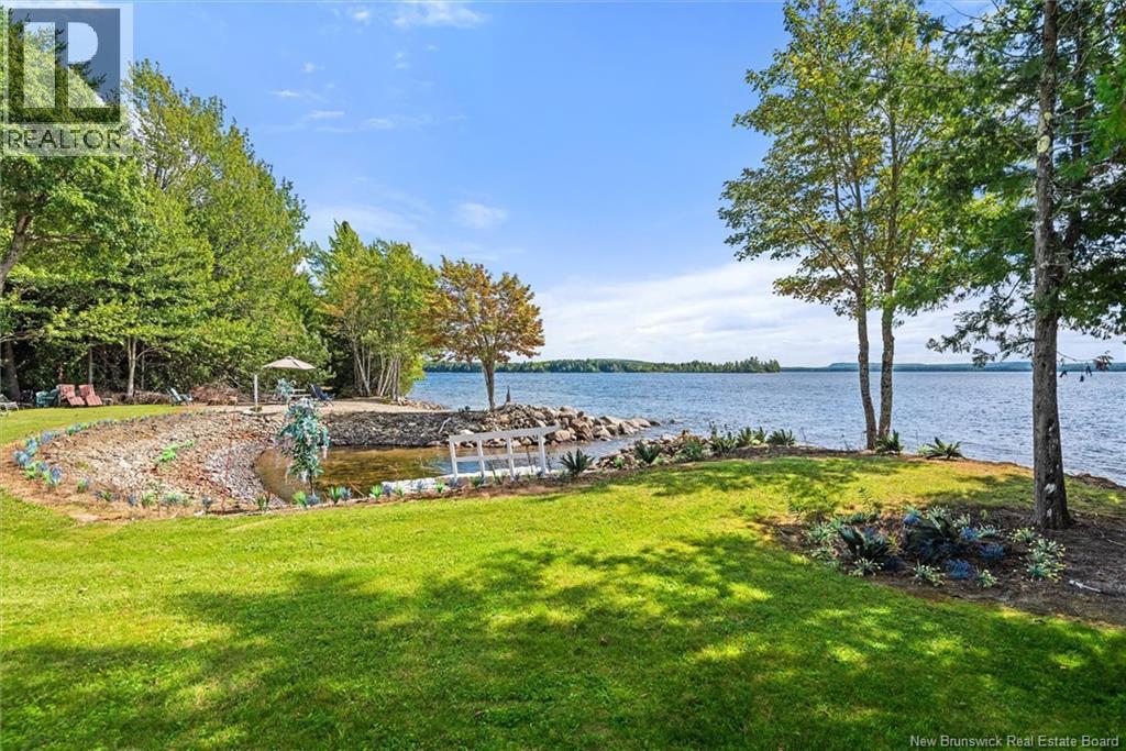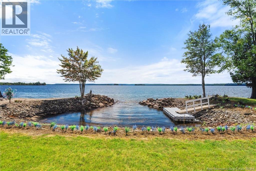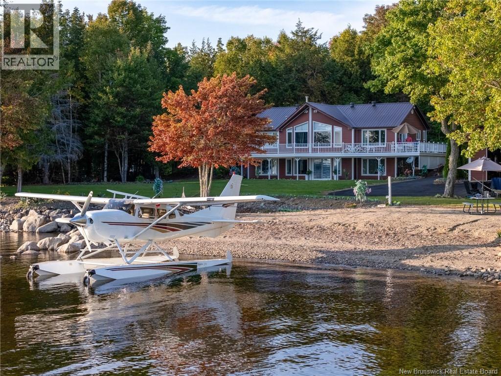 Set on 1.09 acres along the shores of Grand Lake, this exceptional waterfront property offers breathtaking views stretching across the international border. With 2,659 sq. ft. of thoughtfully designed living space, this home is perfectly suited for both relaxed living and entertaining. The main level features a spacious living area filled with natural light, a well-appointed kitchen, dining area, and a walk-in pantry. A large primary bedroom and full 4-piece bathroom complete this level, while a stunning 776 sq. ft. balcony off the living room provides the perfect place to take in the panoramic water views. The walkout lower level offers four additional bedrooms, a full bathroom, and a generous family roomideal for hosting guests or accommodating a growing family. Large windows throughout ensure water views from nearly every room. Comfort is enhanced year-round with two mini-split heat pumps, one on each level. Step outside to enjoy the 443 sq. ft. patio, private beach, dock area, and ample space for a seaplane. A detached garage adds convenience, while the expansive lot provides privacy and room to enjoy the outdoors. A rare opportunity to own a true waterfront retreat with unmatched views and lifestyle potential. (id:35613)