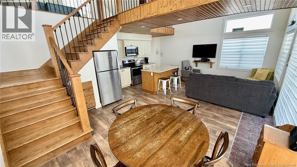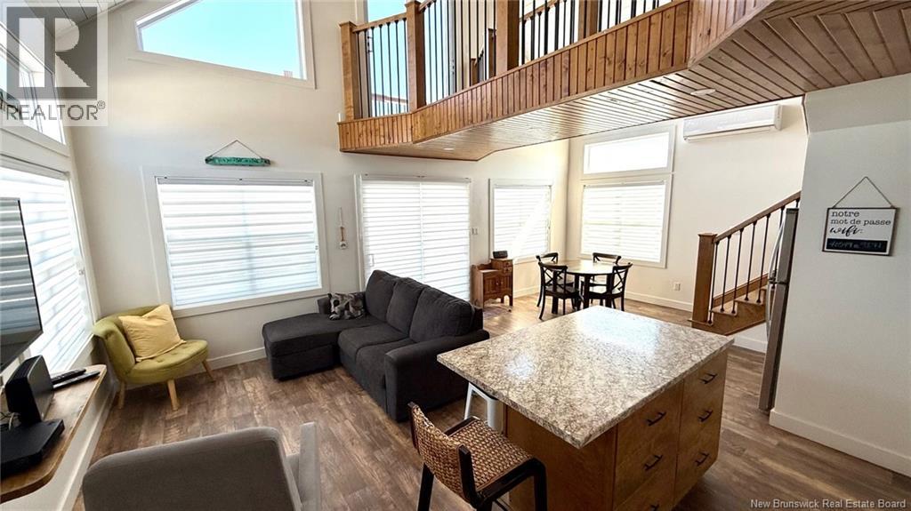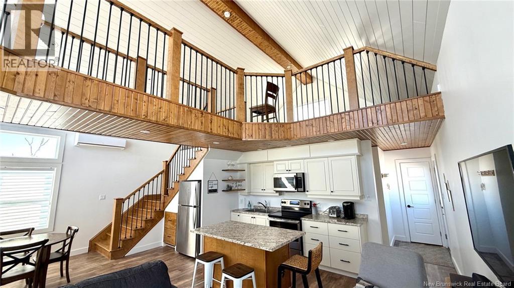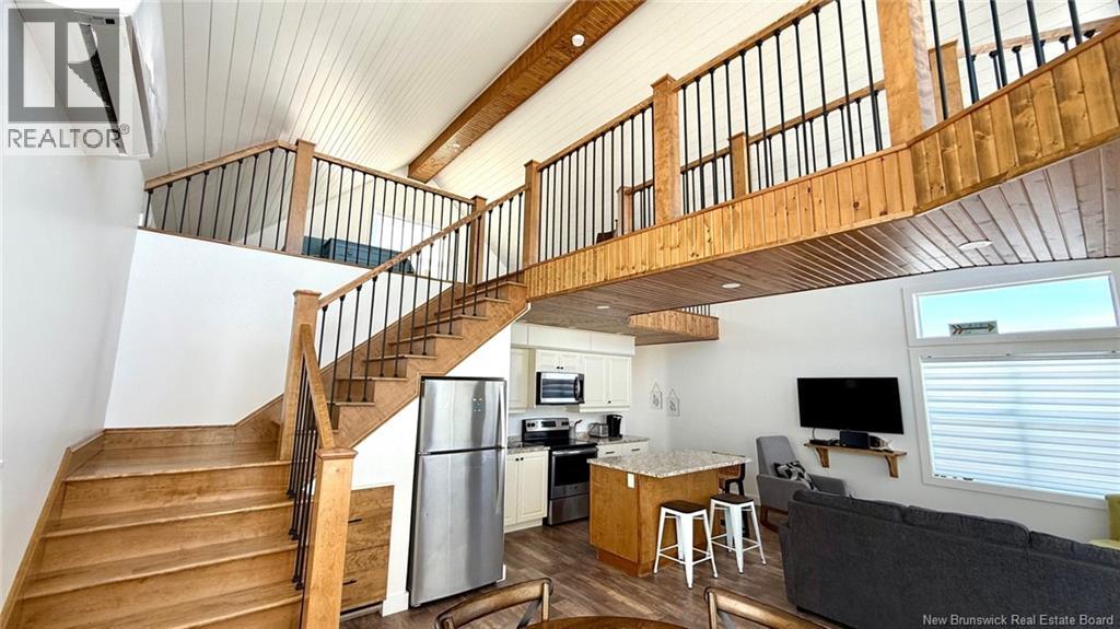 A standout property that blends contemporary design with coastal charm. The cathedral ceiling gives this home a beautiful sense of grandeur while allowing abundant natural light to flood in through the generous windows. A mezzanine overlooks the main living area and houses the master bedroom, which opens onto a balcony offering a direct view of the seaan ideal spot to enjoy a cup of coffee at sunrise or a glass of wine at sunset. The main living area combines the living room, kitchen, and dining room into a welcoming open space. An elegant wooden and metal walkway connects the mezzanine to the upper floor and overlooks the common area, adding character and volume to the whole. A compact and functional room houses the laundry room and the bathroom with shower. The ground floor also includes an additional bedroom, convenient for guests or family. The recently built home is tastefully decorated in a contemporary, minimalist style. It sits on a large 1.5 aces, open lot, offering tranquility, privacy, and direct access to the natural beauty of the Acadian coastline. (id:35613)