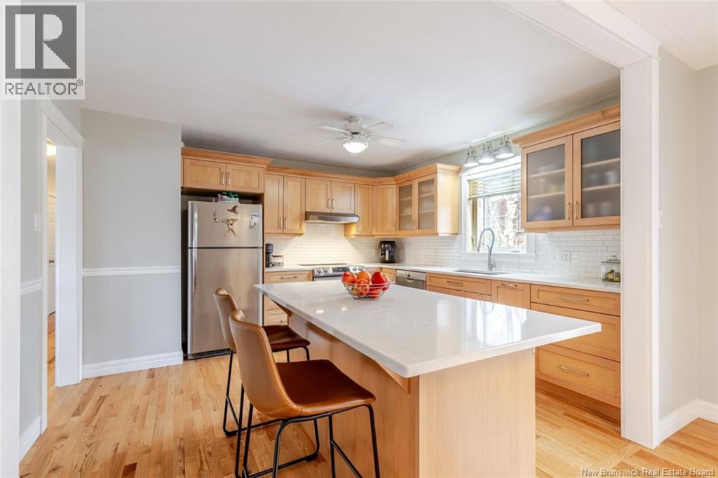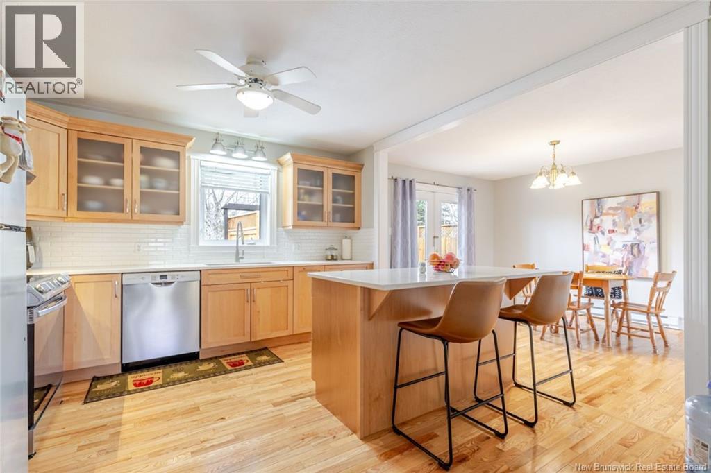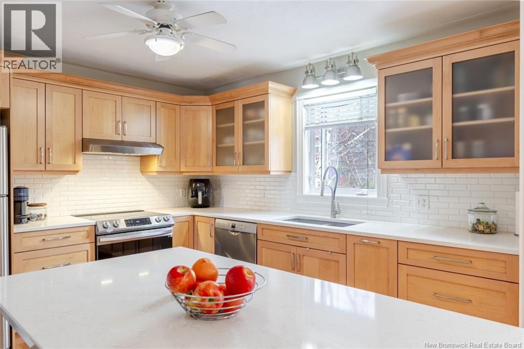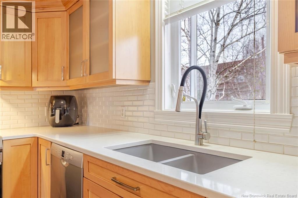 Beautifully updated home in a highly sought-after neighborhood with stunning Saint John River views, great curb appeal, and a private setting surrounded by mature trees. The main floor offers 3 bedrooms, including a primary with walk-in closet and 3-piece ensuite. The renovated kitchen features quartz countertops, maple cabinetry, stainless steel appliances, and a large island, opening to a bright dining area with access to a private deck. A bright and spacious living room with oversized windows and a charming turret showcases the river views. The fully finished lower level includes a family room, flex space, laundry, and a mudroom with garage access. Upgrades: hardwood flooring on the main level, laminate flooring on the lower level, two heat pumps (approx. 4 years old), newer appliances, upgraded attic insulation, and a brand-new private deck (2025). Paved double driveway, attached garage, landscaped lot. Prime location within walking distance to schools, tennis courts, and transit. (id:35613)